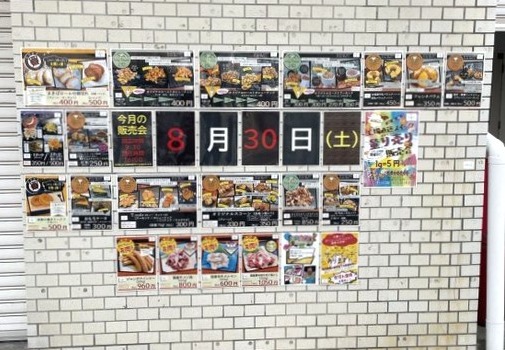 お店の外壁には、販売会のご案内とおすすめの商品が掲示されています。