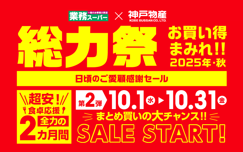 業務スーパー×神戸物産 お買い得まみれ!!2025年・秋「総力祭」第2弾が10月1日(水)~10月31日(金)まで実施中です。