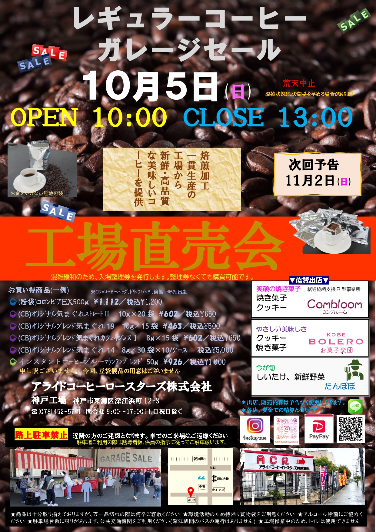 東灘・深江浜町にある「アライドコーヒーロースターズ」さんで、お得な「ガレージセール 工場直売会」が10月5日(日)10時~13時に開催予定だよ!(※開催時間が短縮となっています)#東灘区 #アライドコーヒーロースターズ #イベント #コーヒー