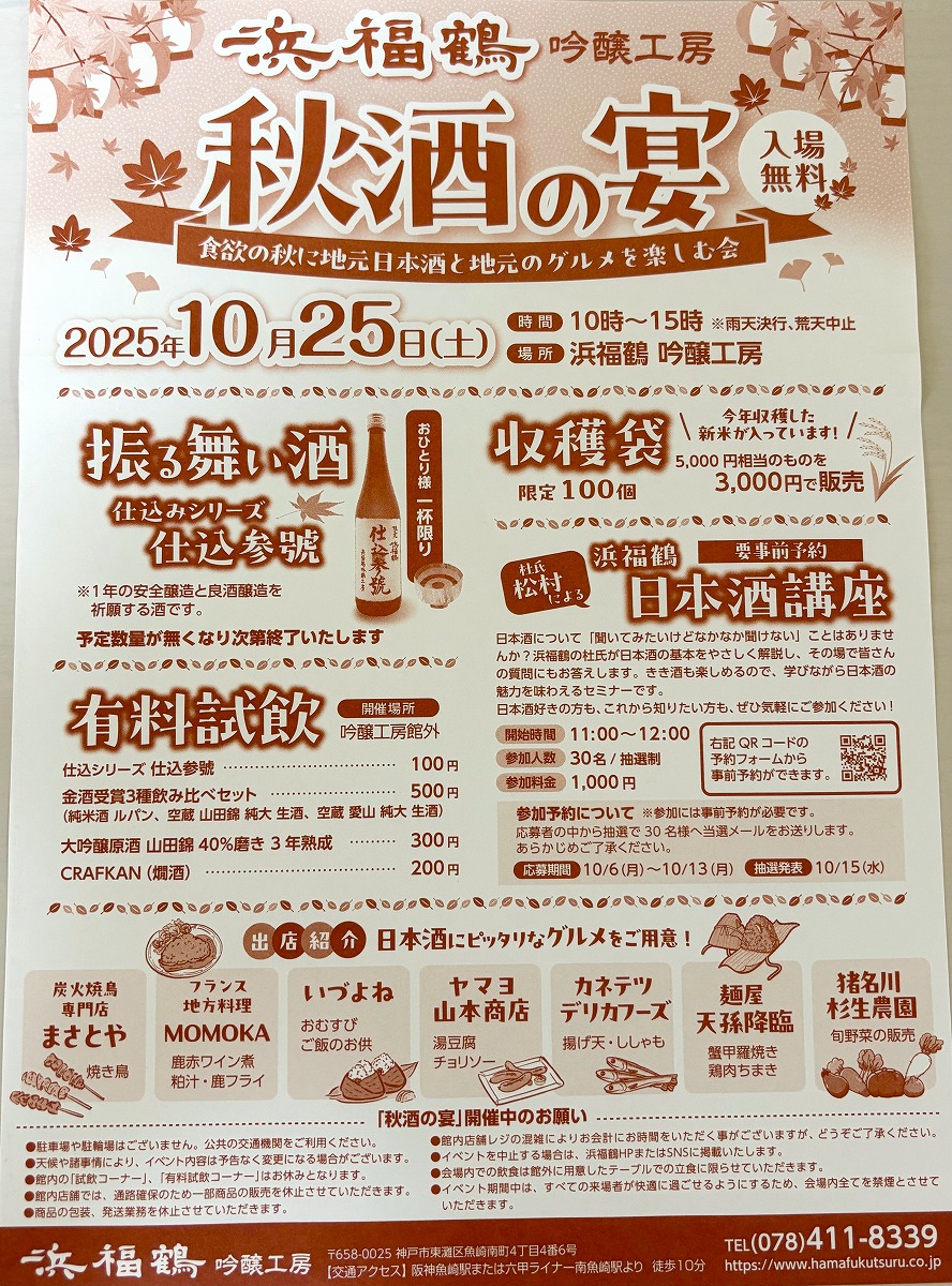 東灘・魚崎の浜福鶴 吟醸工房さんで、10月25日(土)10:00~15:00に秋イベント「秋酒の宴」が開催予定です。