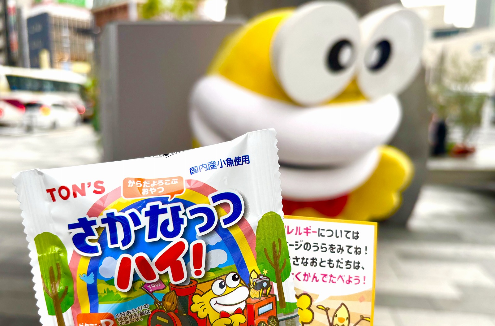この後「さかなっつハイ!」5,000袋が無料配布され、「さかなっつくん」もうれしそう♪(目がクルクルとウィンクしていました)