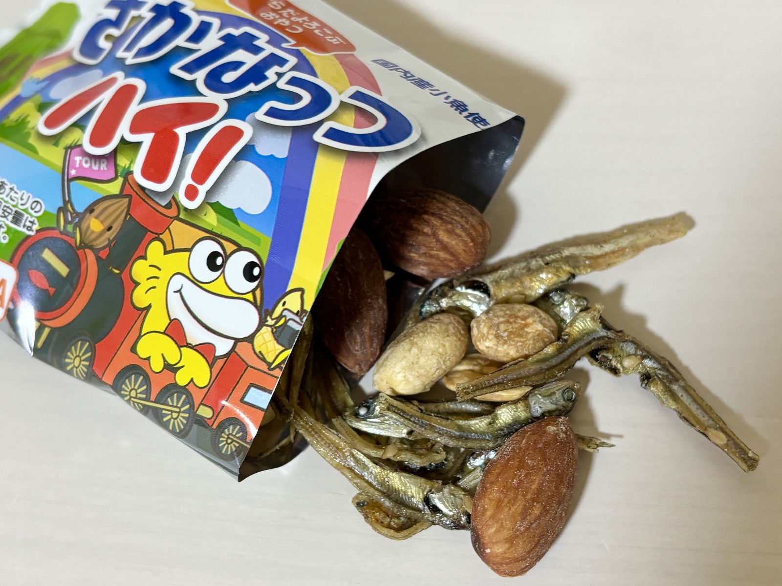 「さかなっつハイ!」には、アーモンド、脱脂ピーナッツ、そして国産の小魚(カタクチイワシ)が使用されています。小魚もカリカリで食べやすいのですが。アーモンドがまた大きくて美味しいんですよね。食べきりの小袋が便利で、おやつやお酒のアテにもおすすめですよ。
