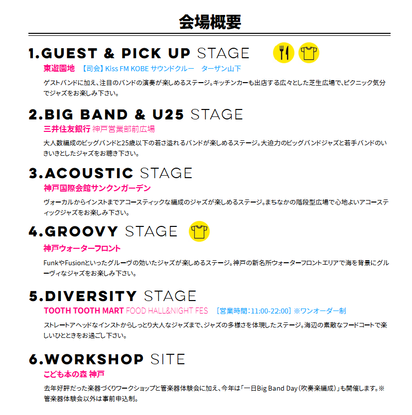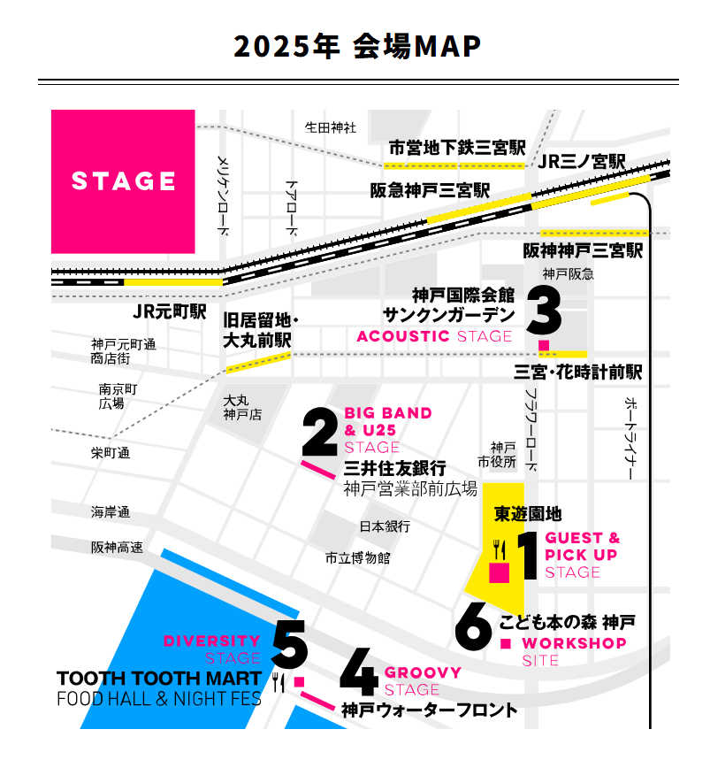開催場所:東遊園地、三井住友銀行 神戸営業部前広場、神戸国際会館サンクンガーデン、神戸ウォーターフロント、TOOTH TOOTH MART FOOD HALL&NIGHT FES、こども本の森 神戸