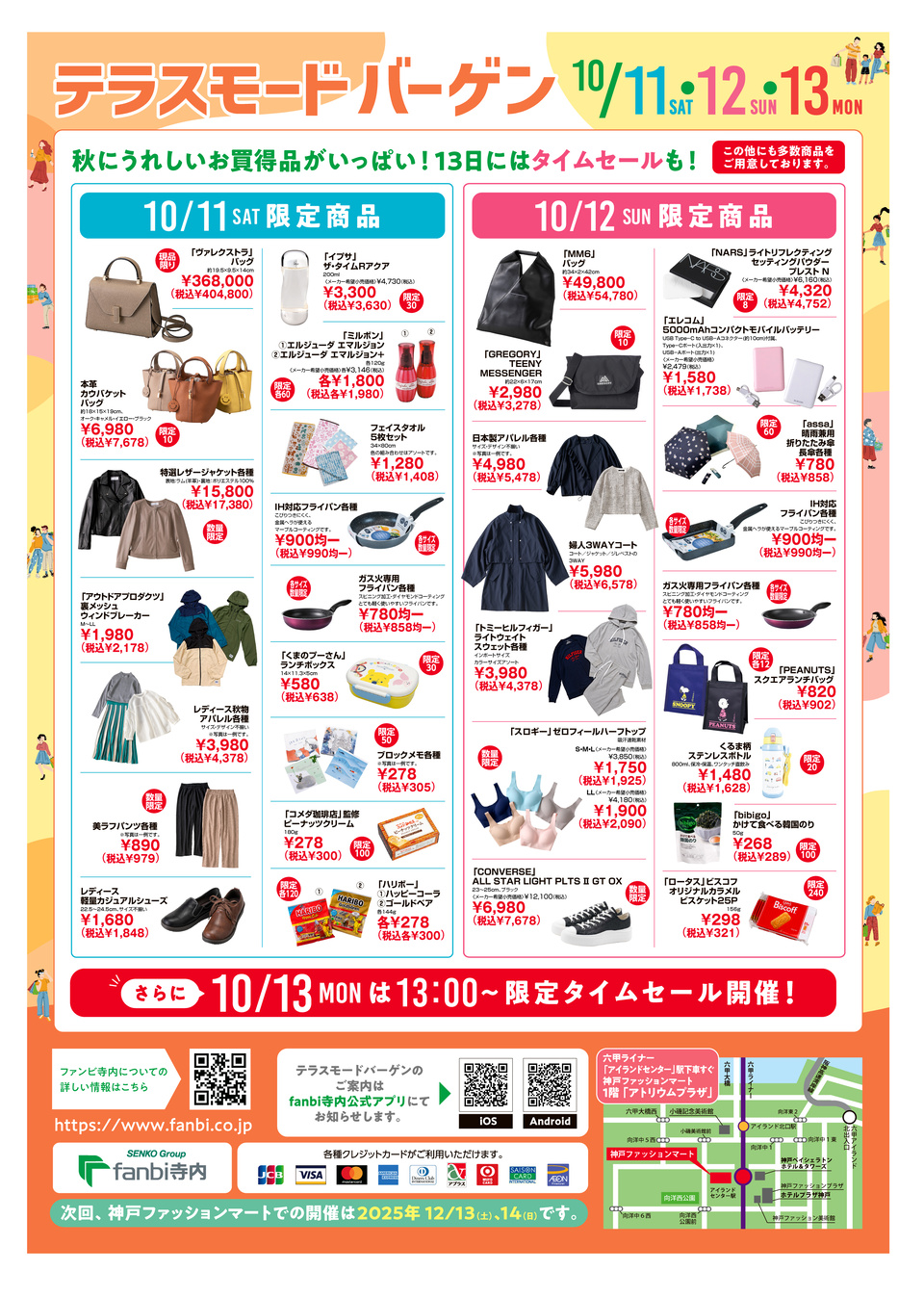 神戸ファッションマートの1階でfanbi寺内出張イベント「テラスモードバーゲン」が10月11日~13日に開催!秋冬に使えるお得な掘り出し物を見つけてね♪#イベント #テラスモードバーゲン #東灘区 #ファンビ寺内