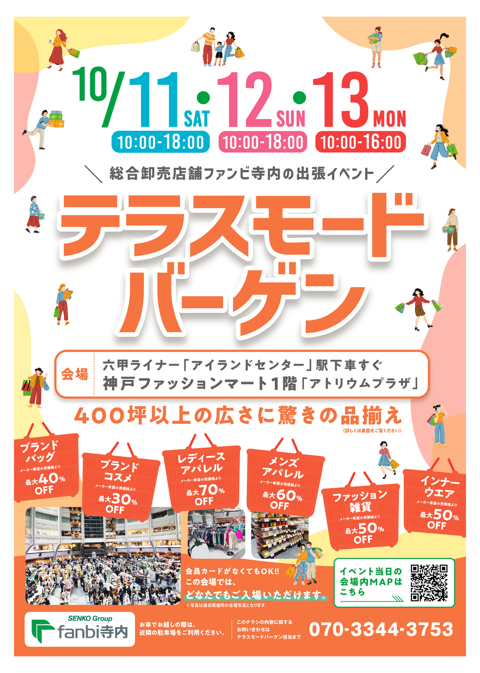 神戸ファッションマートの1階でfanbi寺内出張イベント「テラスモードバーゲン」が10月11日~13日に開催予定です。