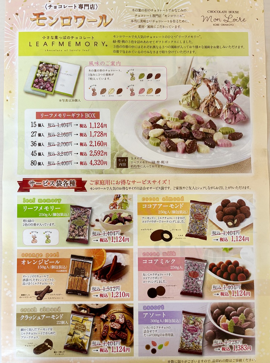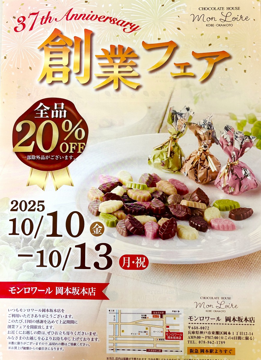 東灘・岡本にある「モンロワール 岡本坂本店」さんで、2025年10月10日(金)~13日(月・祝)まで創業フェアを開催中!お得な全品20%OFFをお見逃しなく! #モンロワール #神戸岡本 #チョコレート #東灘区