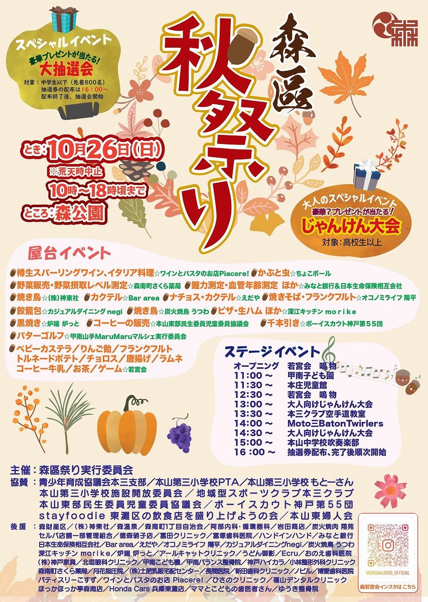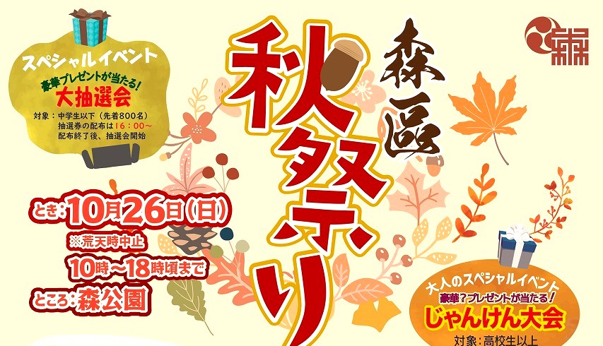 東灘・森公園で「森区 秋祭り」が10月26日に開催予定!屋台やステージパフォーマンス、 大人のじゃんけん大会、 豪華景品が当たる大抽選会など、1日中楽しめる企画が盛りだくさん♪ #イベント #東灘区 #森区 #秋祭り
