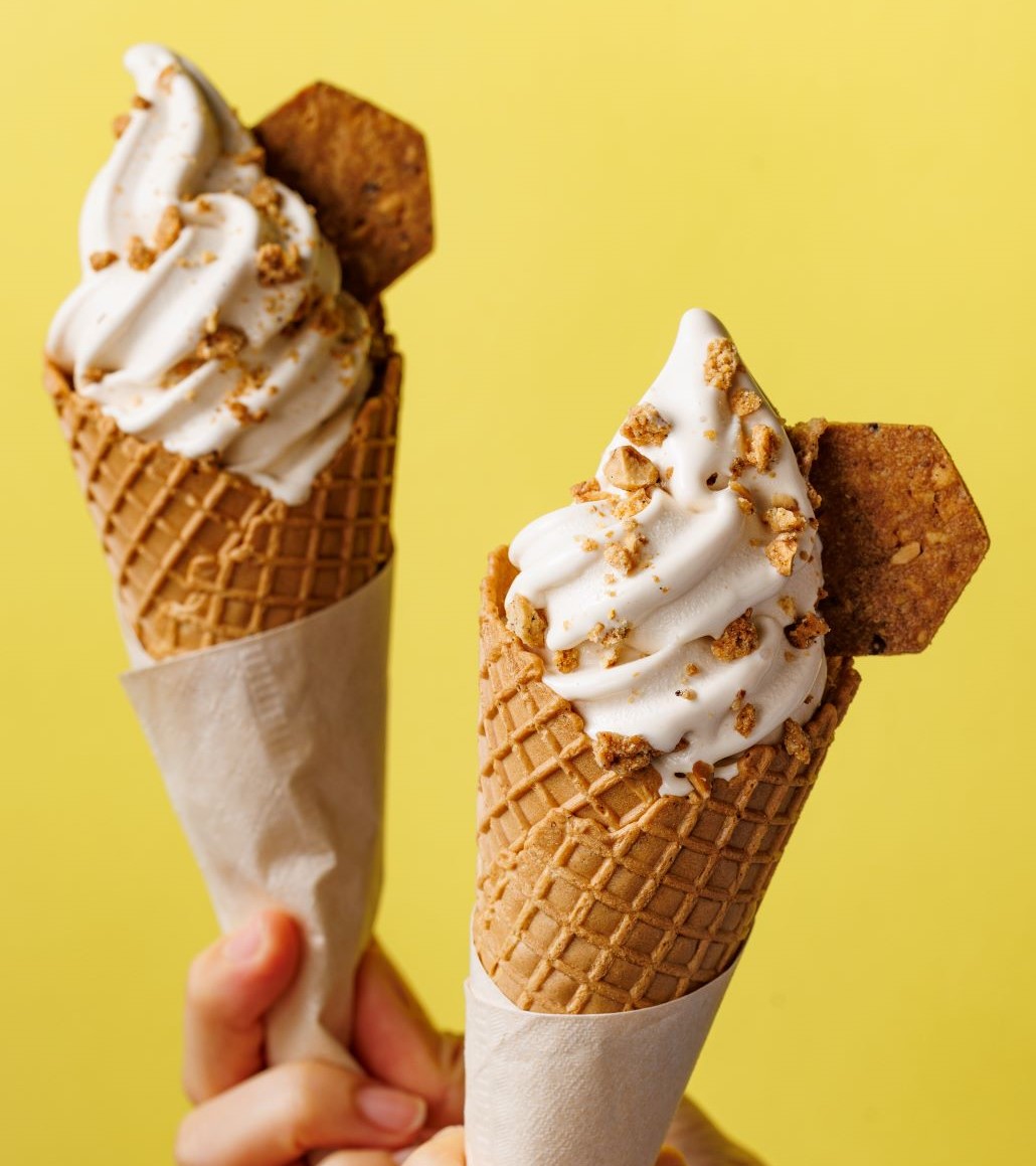 「ル・ビスキュイ・アラン・デュカス」で人気のバターの風味たっぷりのビスケット「ピュール・ブール」がソフトクリームに。仕上げには、クランブルのようなザクザク食感が楽しいビスケット「スブリ」とヘーゼルナッツのビスケットをトッピング。ミルクのくちどけに香ばしいバターの風味が広がります。