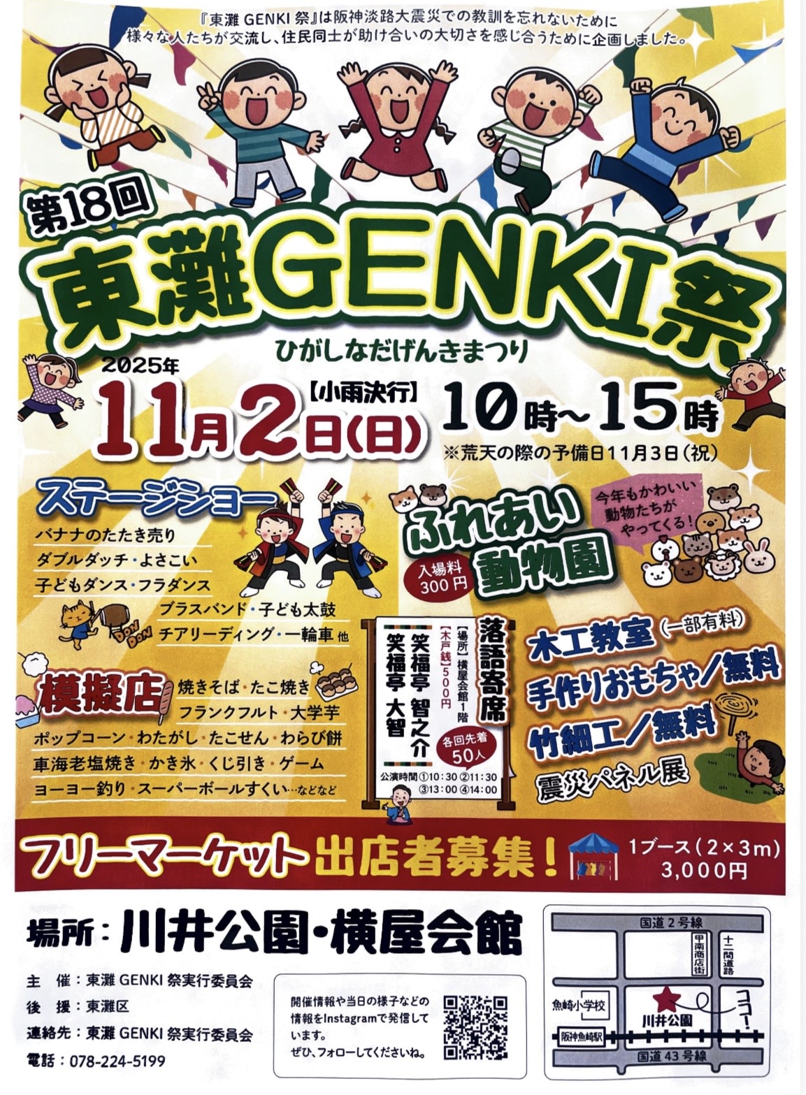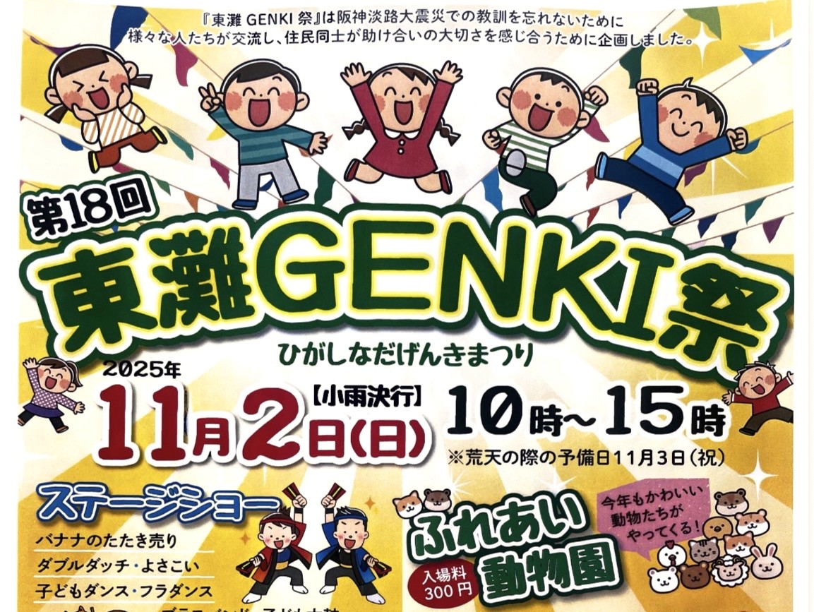 東灘の川井公園・横屋会館で「第18回東灘GENKI祭」が2025年11月2日(日)に開催予定ということで、ご案内をお寄せ頂きました。