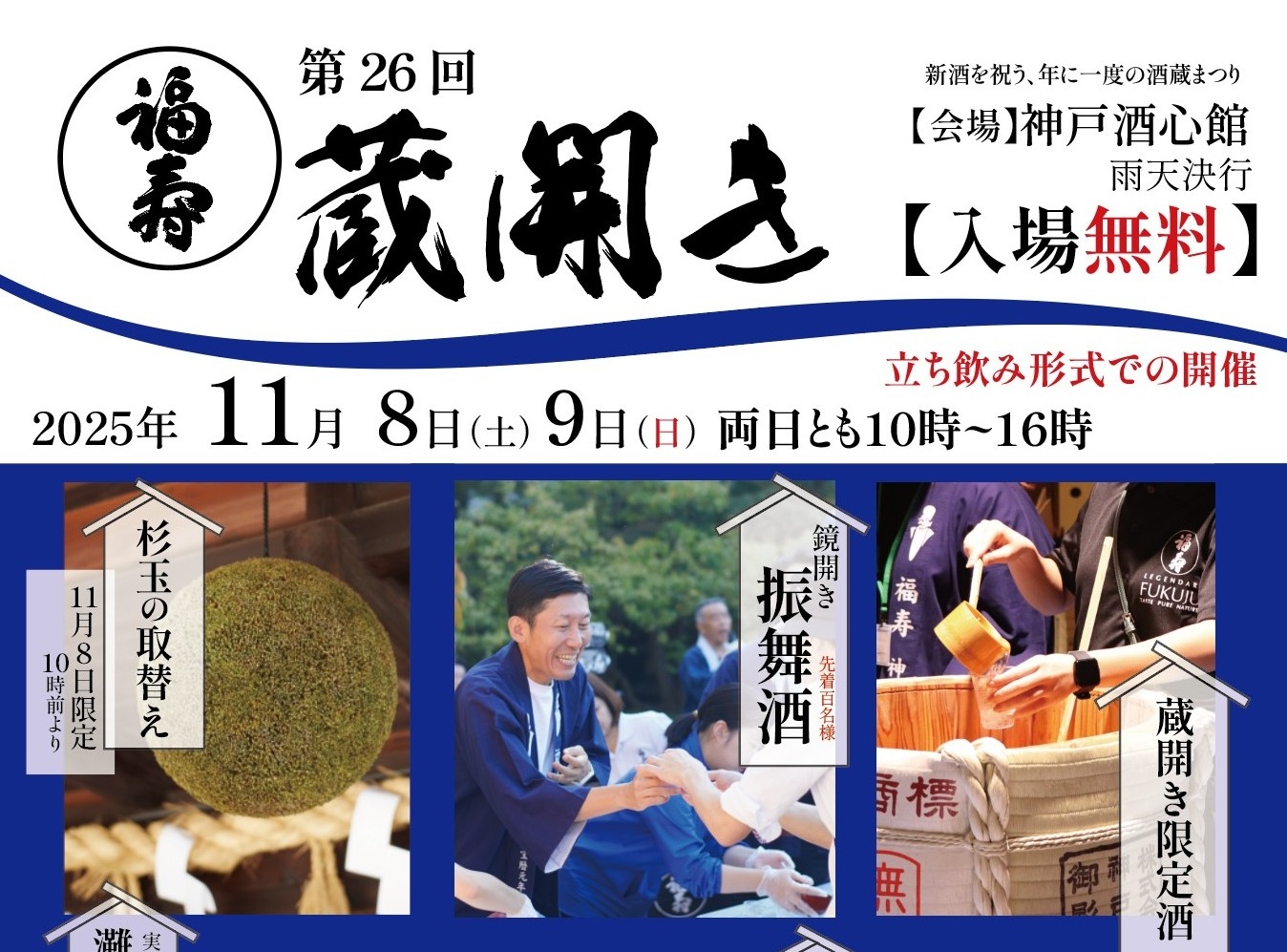 神戸酒心館で「第26回 福寿 蔵開き」が2025年11月8日(土)・9日(日)に開催予定ということで、ご案内をお寄せ頂きました。