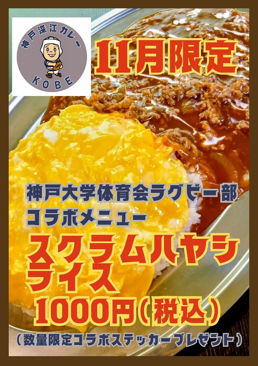 東灘・本庄町にある「神戸深江カレー」さんで、神戸大学体育会ラグビー部とのコラボメニュー「スクラムハヤシライス」が11月限定で登場しますよ、ということでご案内をお寄せ頂きました。
