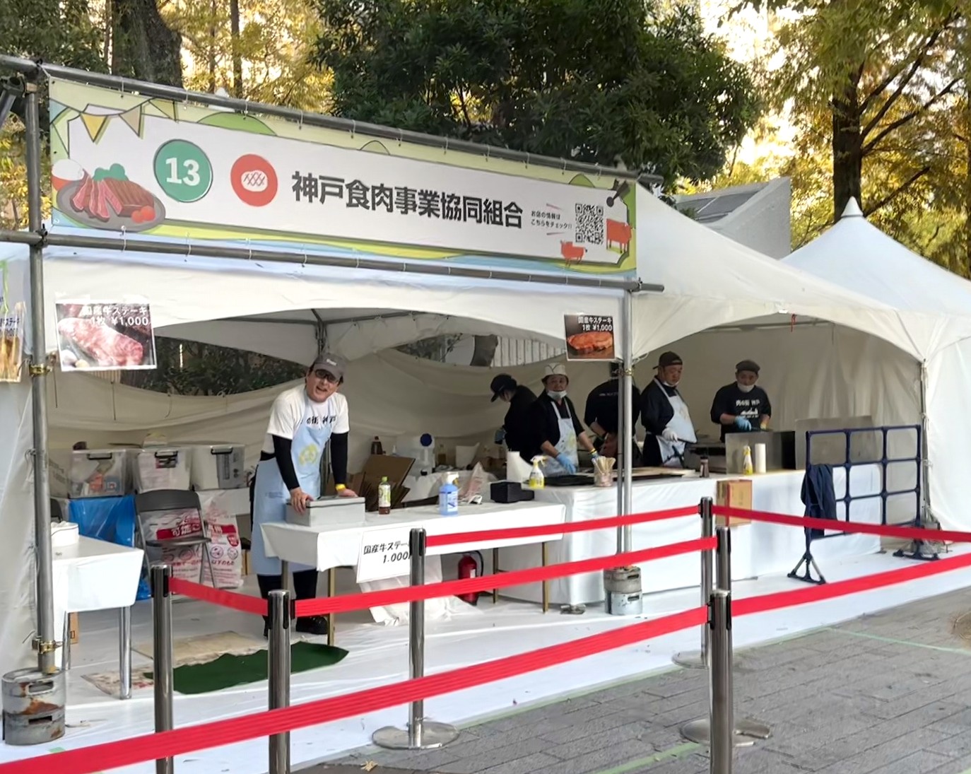次に並んだのが「神戸食肉事業協同組合」さんの「国産牛ステーキ」(1000円)。大きいお肉を隣の鉄板でじゅうじゅう焼いています。