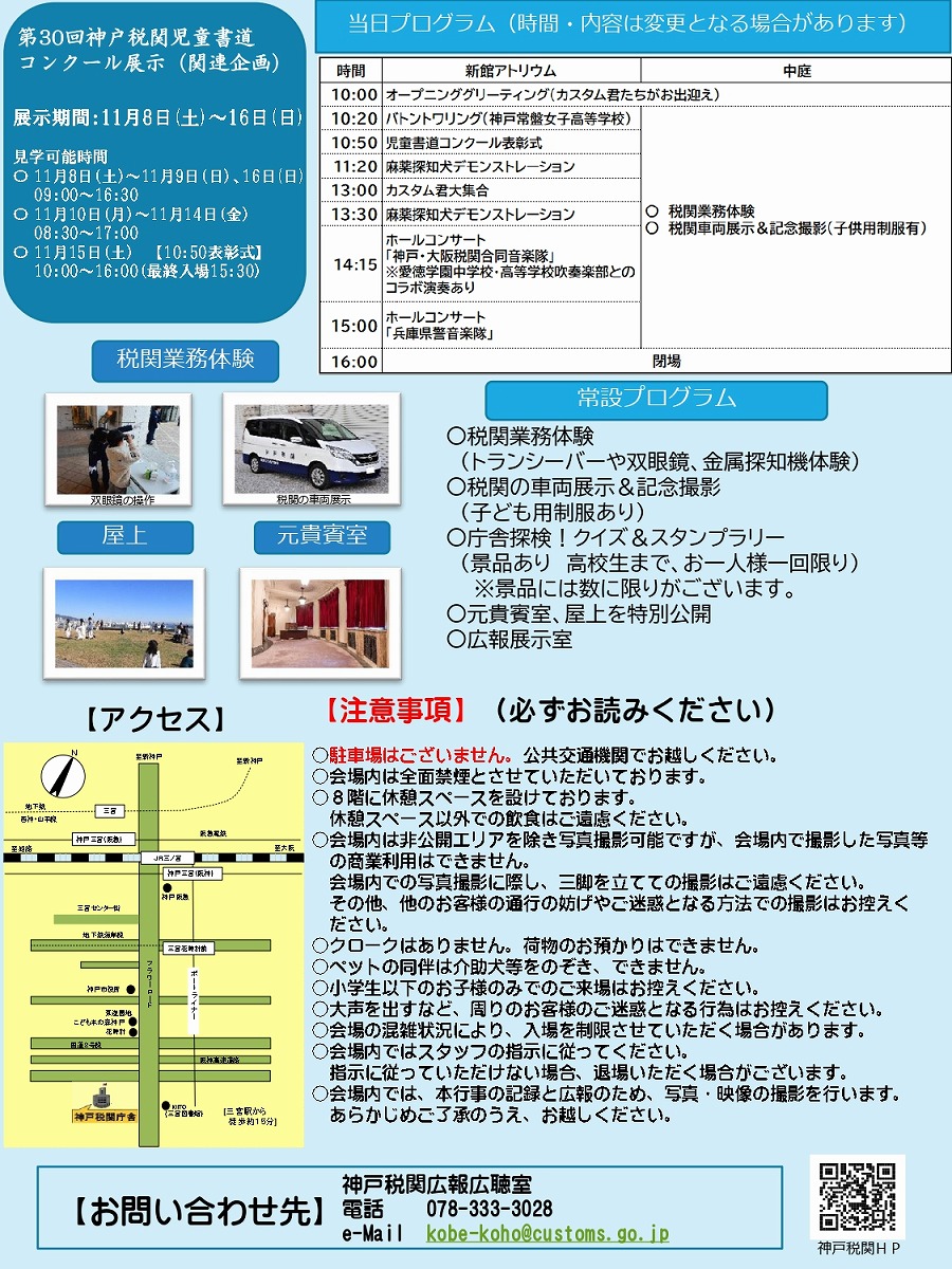 神戸港を一望できる屋上や普段は一般公開していない元貴賓室を公開するとともに、ホールコンサートや、麻薬探知犬のデモンストレーションなどのプログラムが予定されています。各港で活躍している税関のイメージキャラクター「カスタム君」も大集合!