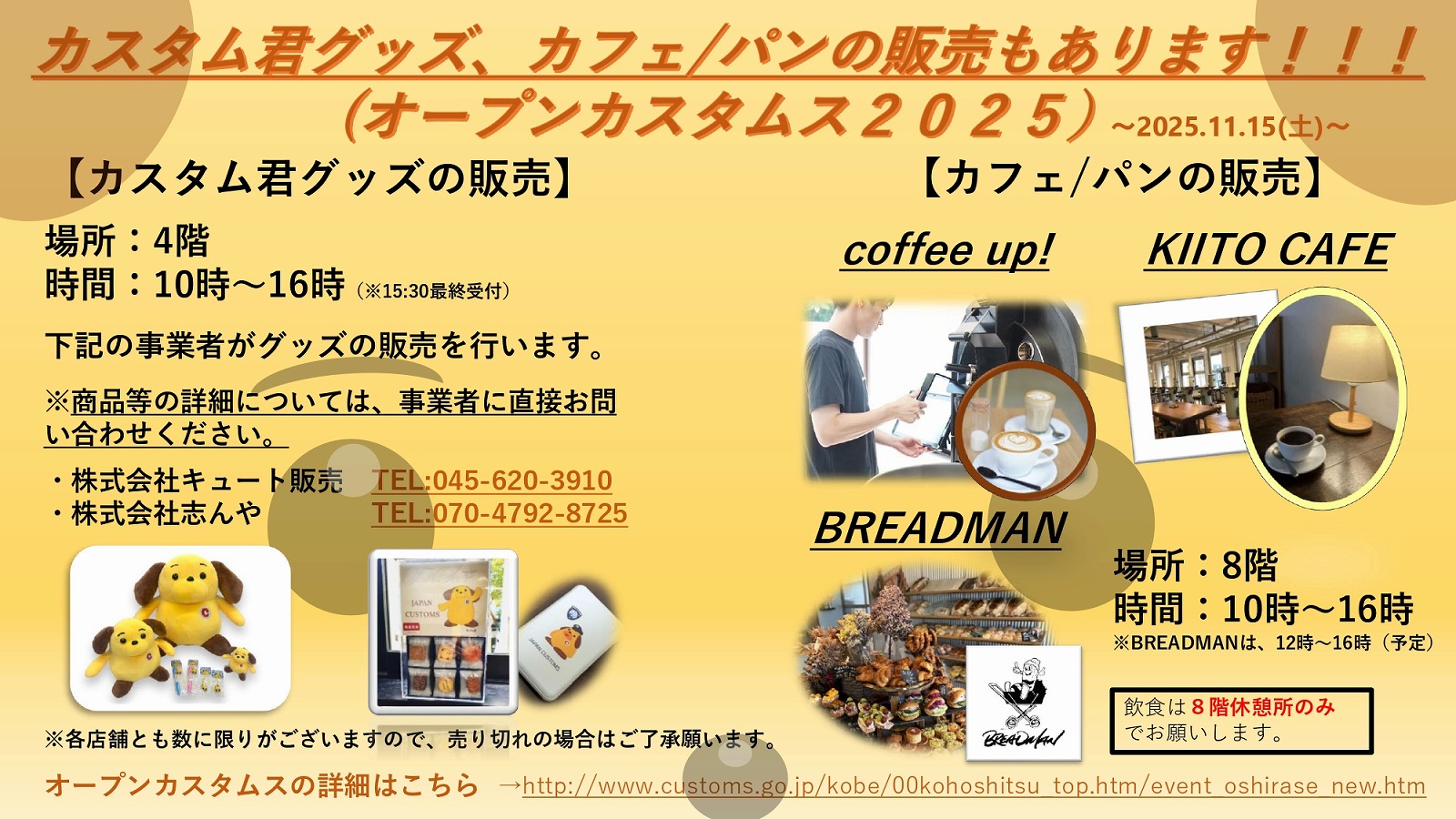 神戸税関で「オープンカスタムス2025」が11月15日(土)に開催予定!屋上や元貴賓室の公開、コンサートや麻薬探知犬のデモンストレーションなどのプログラムの他、カスタム君グッズ、カフェ/パンの販売も企画されているみたい #神戸税関 #オープンカスタムス