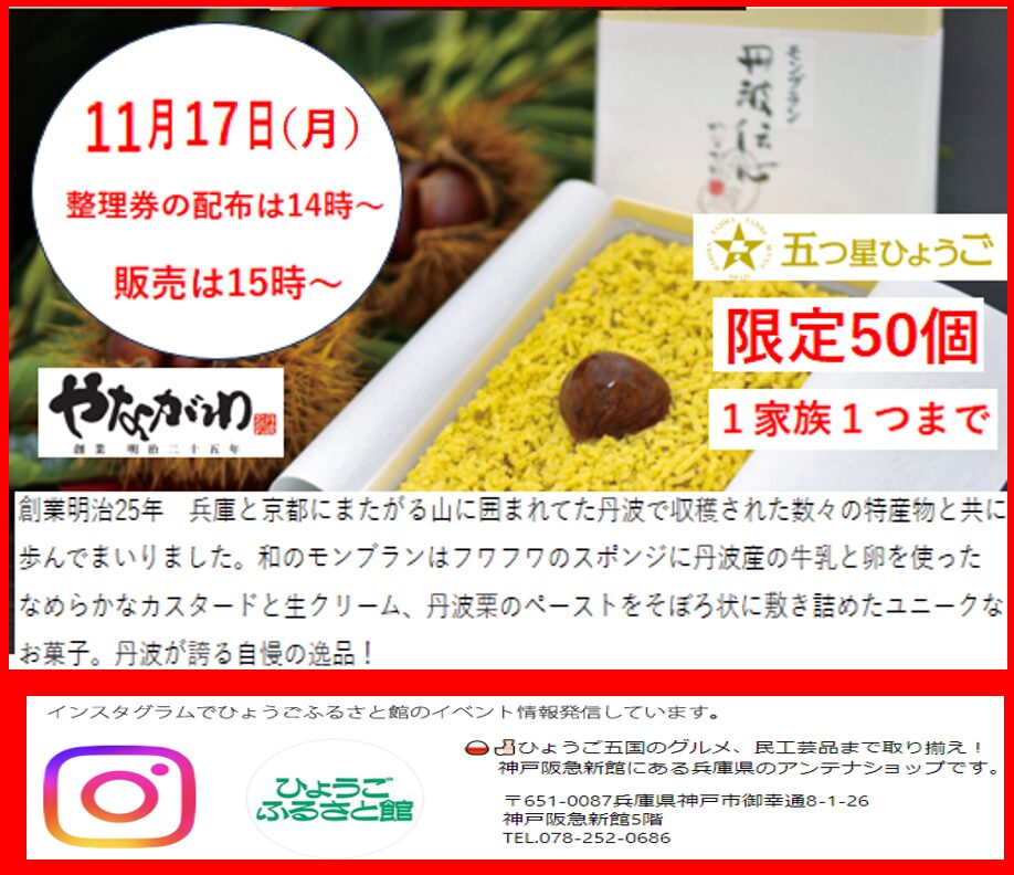 神戸阪急新館5階にある「ひょうごふるさと館」さんで、11月17日(月)にやながわさんの「和のモンブラン」の50個限定販売イベントが開催予定ということで、情報をお寄せ頂きました。
