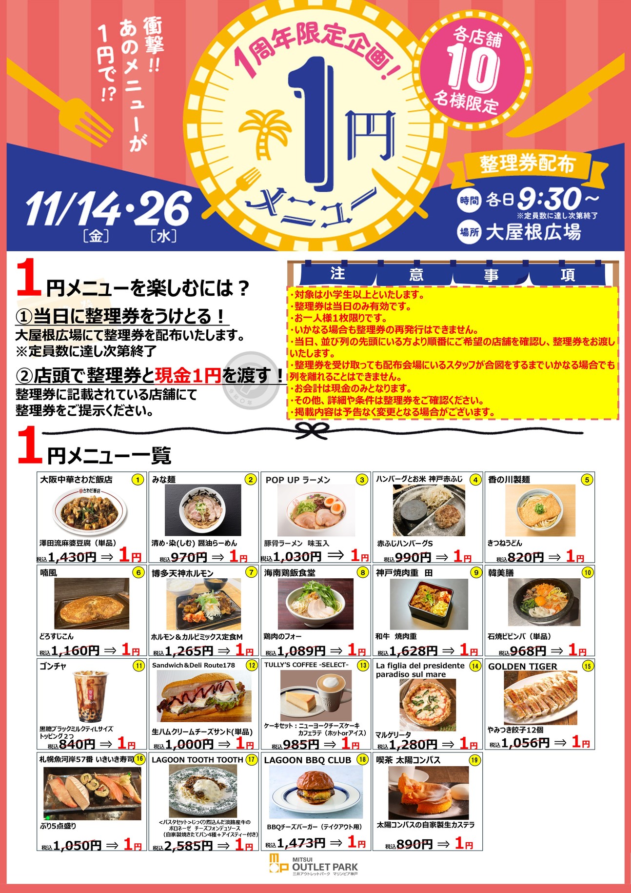 開業1周年を記念し、1周年祭初日の11月14日(金)と、開業日である11月26日(水)の2日間、飲食店約20店舗が参加して「1円メニュー」を展開します。各店自慢の看板メニューを数量限定で“1円”でご提供。“驚きのおトク体験”を感謝の気持ちを込めてお届けします。