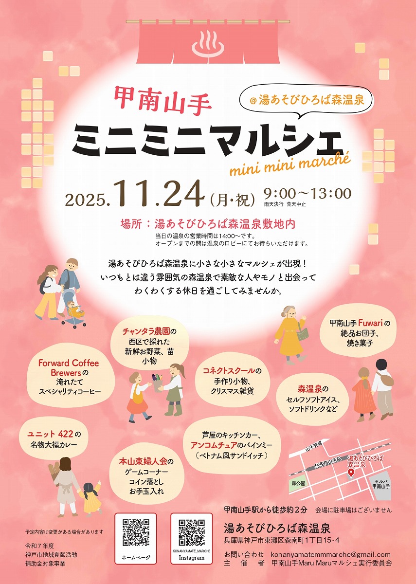 東灘の湯あそびひろば森温泉で「甲南山手ミニミニマルシェ」が11月24日(祝)に開催予定!採れたて野菜、淹れたてコーヒー、和菓子、カレー、ゲーム、小物販売などの出店を楽しんで♪ イベント #東灘区 #甲南山手ミニミニマルシェ