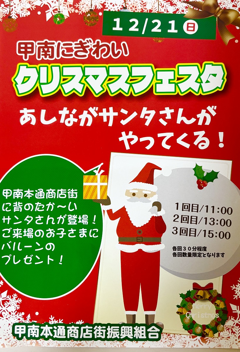 東灘・甲南本通商店街で「甲南にぎわいクリスマスフェスタ」が2025年12月21日(日)に開催予定!背の高いサンタさんがバルーンアートをプレゼントしてくれるみたい♪ #東灘区 #イベント #クリスマスフェスタ