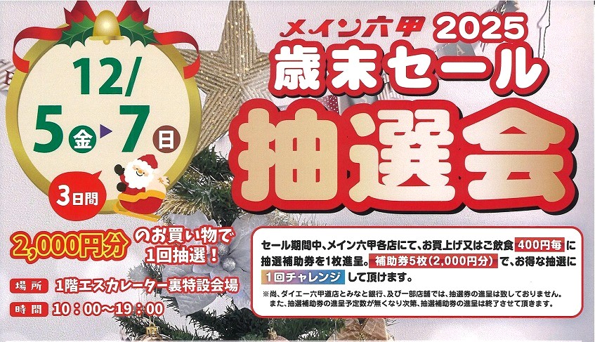 メイン六甲で「2025歳末セール抽選会」が12月5日(金)~7日(日)に開催予定ということで、読者様より情報とお写真をお寄せ頂きました。