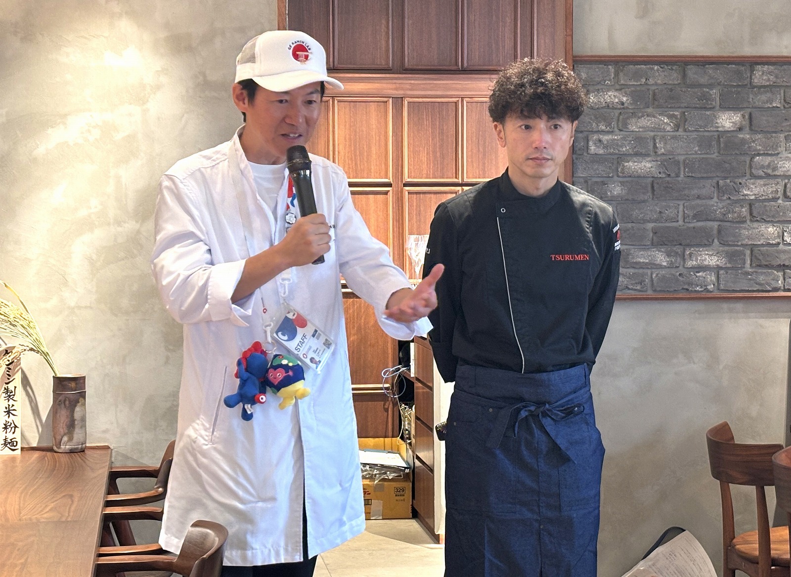 ケンミン食品株式会社 高村祐輝 代表取締役社長(左)、「GF RAMEN LAB」所長の大西益央シェフ(右)