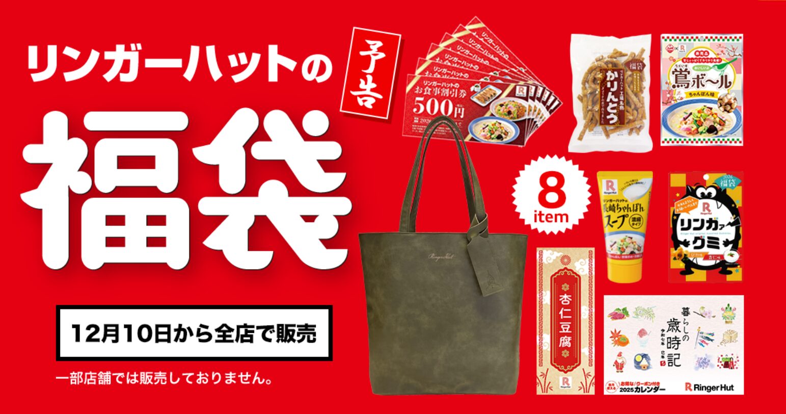 リンガーハットの〈福袋〉が数量限定販売!3,000円分の「お食事割引券」の他、濃縮ちゃんぽんスープやかりんとう、トートバッグなど8アイテム♪店頭にて2025年12月10日(水)より順次販売開始! #リンガーハット #福袋