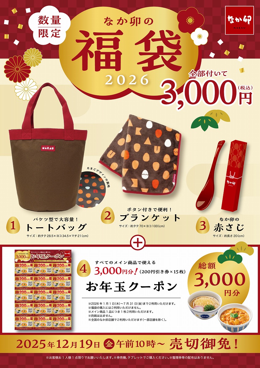 「なか卯の福袋」(税込3,000円)が2025年12月19日(金)AM10:00~全国のなか卯で店頭販売がスタートされます。
