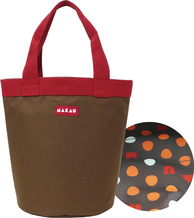 なか卯の赤いワッペンが映える、落ち着いた風合いのトートバッグです。裏地には、なか卯の“こだわり卵”をモチーフにしたたまごデザインをあしらいました。バケツ型で大容量のため、荷物が多い日のお出かけにもぴったりです。