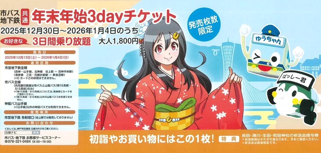 神戸市バス・地下鉄共通年末年始3dayチケットが12月13日~2026年1月4日まで数量限定で販売中。12月30日~1月4日までのお好きな3日間、市バス・地下鉄などが乗り放題で1800円! #神戸市バス #神戸市営地下鉄 #年末年始