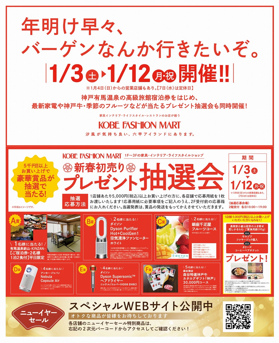 1店舗で5,000円(税込)以上お買い上げの方に、有馬温泉の高級旅館宿泊券や話題の家電商品など、豪華賞品が抽選で当たる「新春初売り プレゼント抽選会」も開催されますよ♪