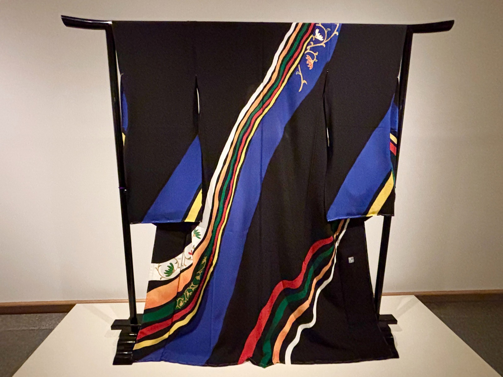 お隣には《日本髪の娘》のモデル、上田種子が着用した着物のレプリカも展示されています。黒地に吹き流れるように上から下へ青・赤・緑・オレンジ・菊唐草文が施された、抽象性の高いデザインが特徴です。