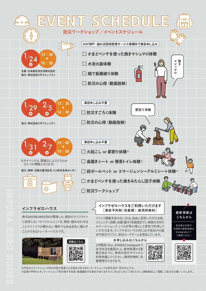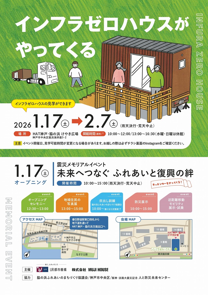 神戸脇の浜で「震災メモリアルイベント~未来へつなぐふれあいと復興の絆~」が1月17日に開催!インフラゼロハウス内で防災ワークショップおよび写真展の他、かまどベンチを使った炊き出し訓練やスマートモビリティ試乗体験などを予定 #イベント #インフラゼロハウス