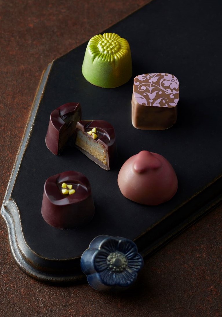 丹波黒大豆を炊き上げた白あんのほっくりとした自然な甘さのガナッシュと、中近東の果実“デーツ”のガナッシュを重ねた2層仕立てのボンボンショコラが主役の神戸阪急限定セレクションです。