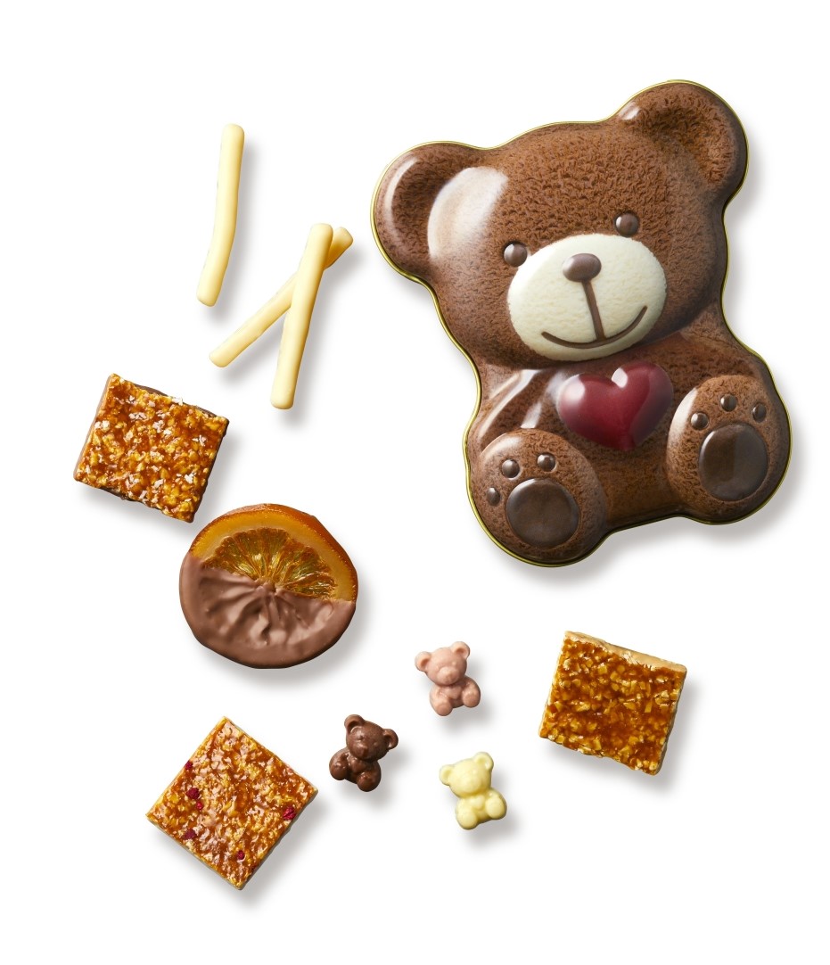 「カカオサンパカ」を代表するベアチョコレートの“ハートベア カロロ”から、キュートなベア缶が登場。ミニベアのチョコレートに加えて、さわやかなレモンピールなどセットしました。