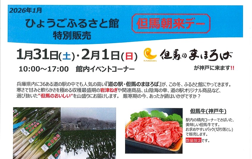 神戸阪急新館5階にある「ひょうごふるさと館」さんで、1月31日・2月1日に「道の駅・但馬のまほろば」のおいしいもの 特別販売イベントのご案内をお寄せ頂きました。