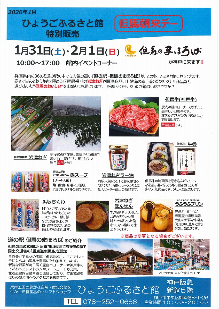 神戸阪急新館5階にある「ひょうごふるさと館」さんで、1月31日・2月1日に「道の駅・但馬のまほろば」のおいしいもの 特別販売イベントのご案内をお寄せ頂きました。