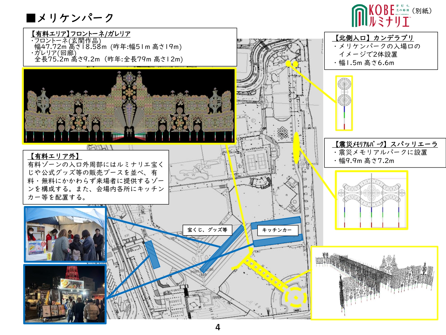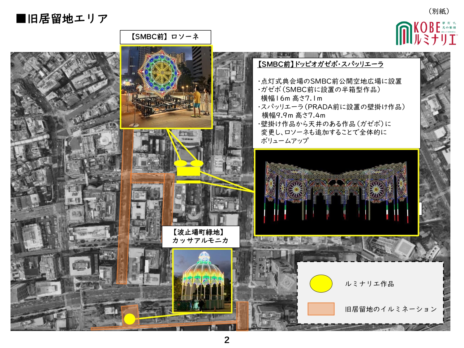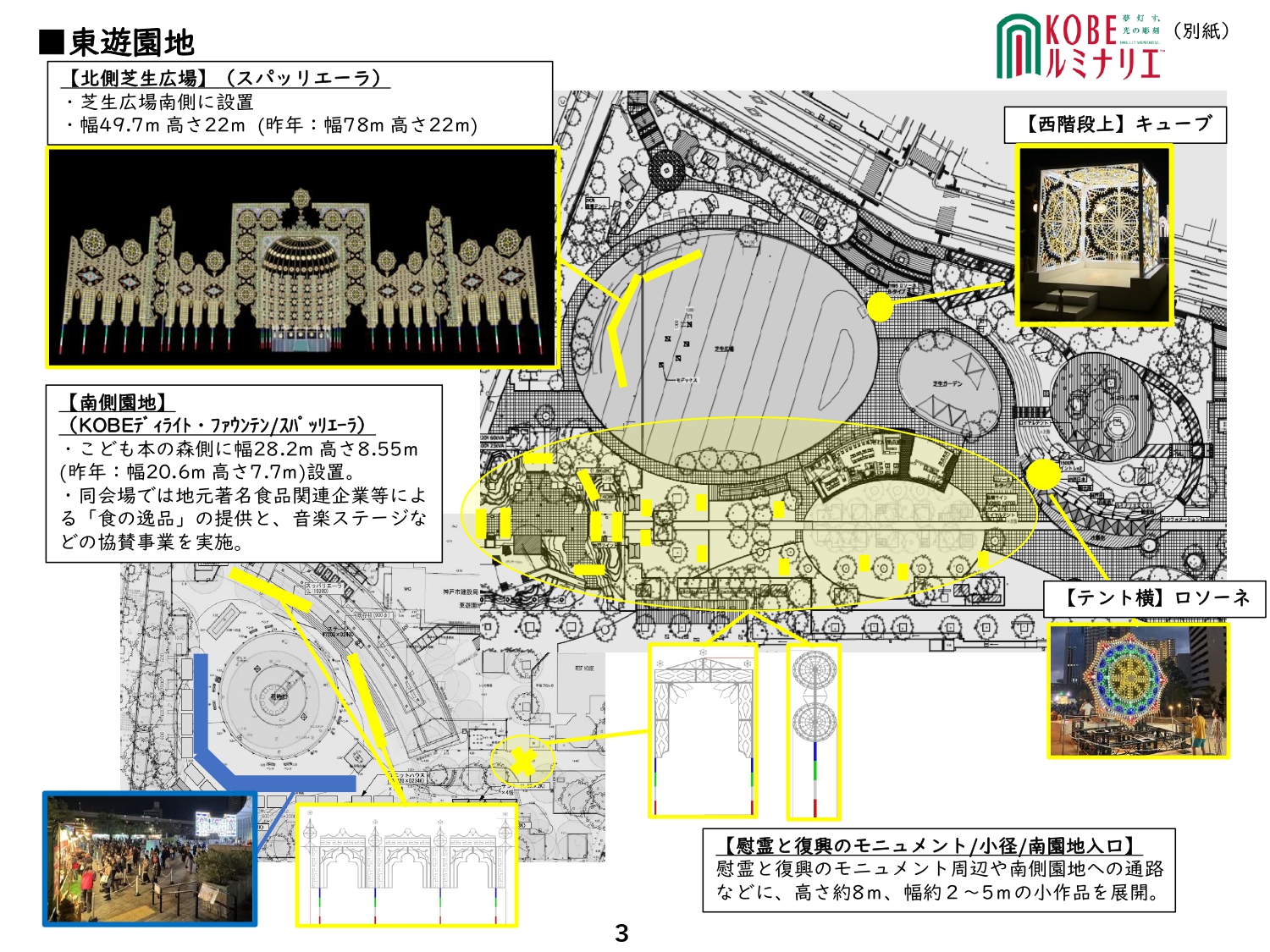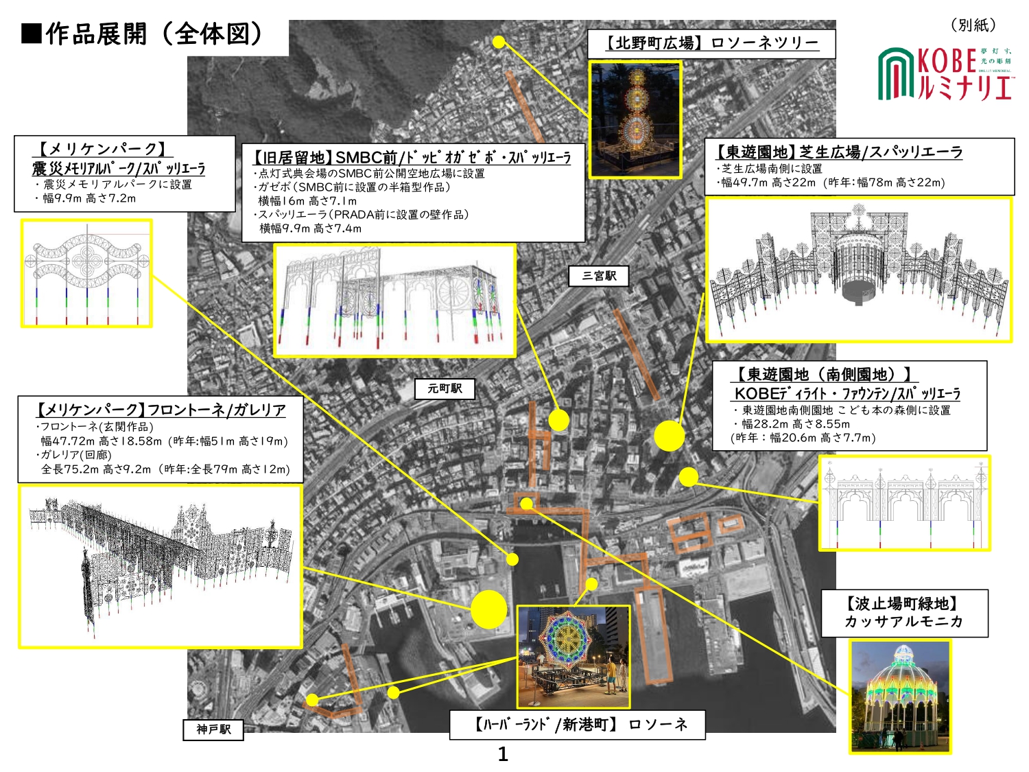 芝生広場に全長約50メートル最高部の高さ22メートルの光の壁掛け作品「スパッリエーラ」を設置します。また、南側園地では高さ約9メートル、幅約14メートルの「スパッリエーラ」2体を設置するとともに、地元著名食品関連企業等による「食の逸品」の提供と音楽ステージなどの協賛事業(KOBEディライト・ファウンテン)を実施します。