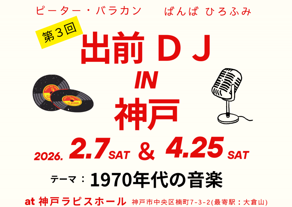 - 2026年2月7日(土)と4月25日(土)に開催 ※※内容やお申込みの詳細は、ピーター・バラカンの出前DJ in 神戸 WEBページでご確認ください。