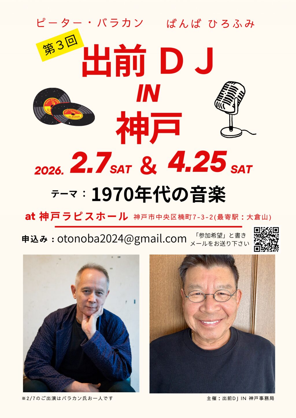 - 2026年2月7日(土)と4月25日(土)に開催 ※※内容やお申込みの詳細は、ピーター・バラカンの出前DJ in 神戸 WEBページでご確認ください。