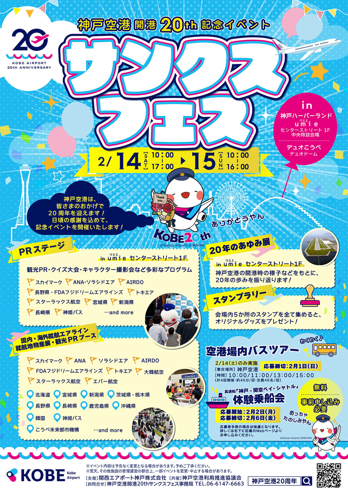 「神戸空港開港20周年 サンクスフェス」が2026年2月14日(土)・15日(日)に神戸ハーバーランドumieと神戸空港、その他で開催予定です。