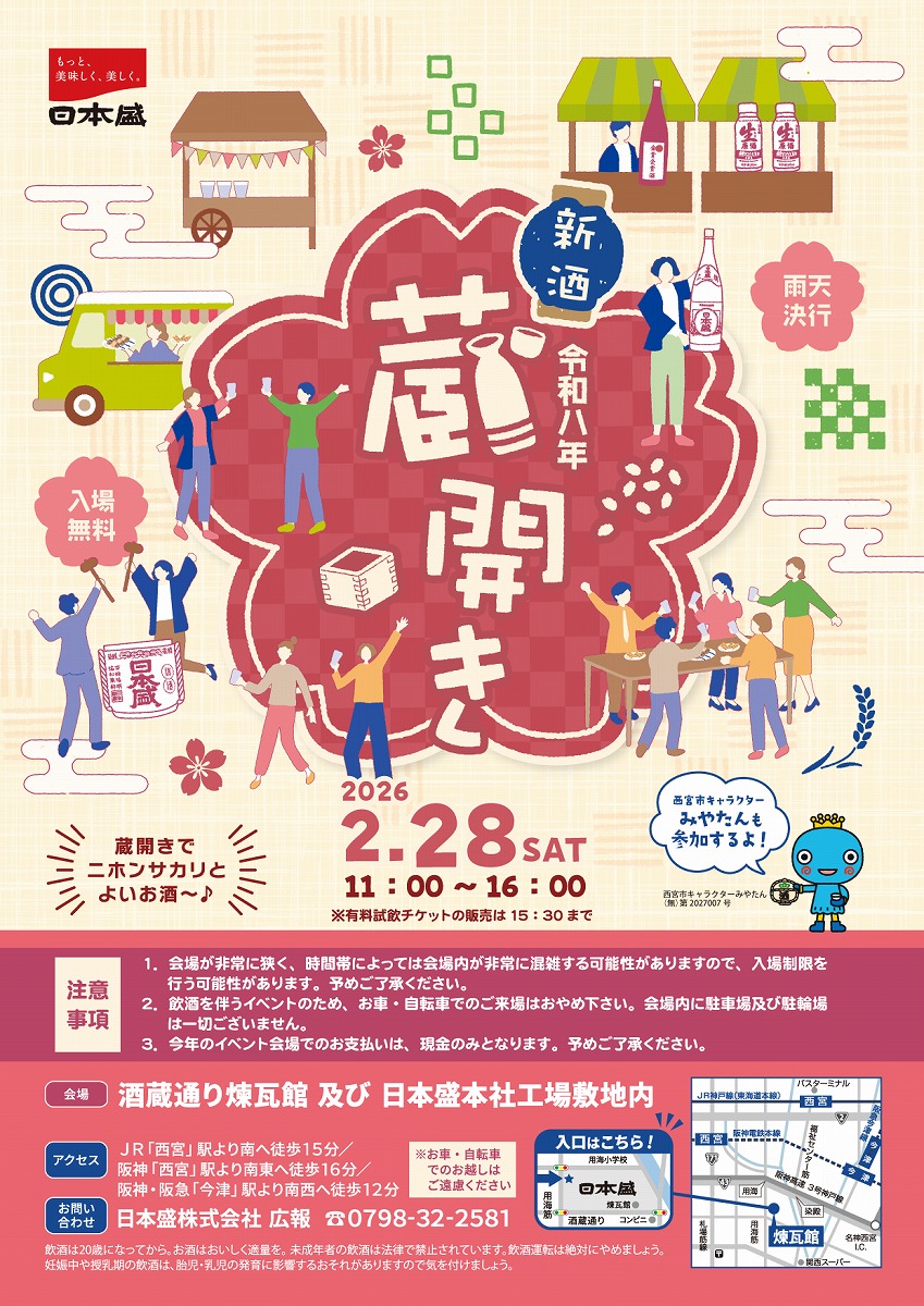 西宮にある日本盛本社工場および酒蔵通り煉瓦館で「日本盛 新酒蔵開き」が2026年2月28日(土)に開催予定です。