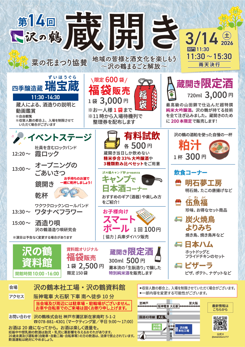 沢の鶴本社工場と資料館で2026年3月14日(土)「第14回 蔵開き~沢の鶴まるごと開放~」が開催予定です。