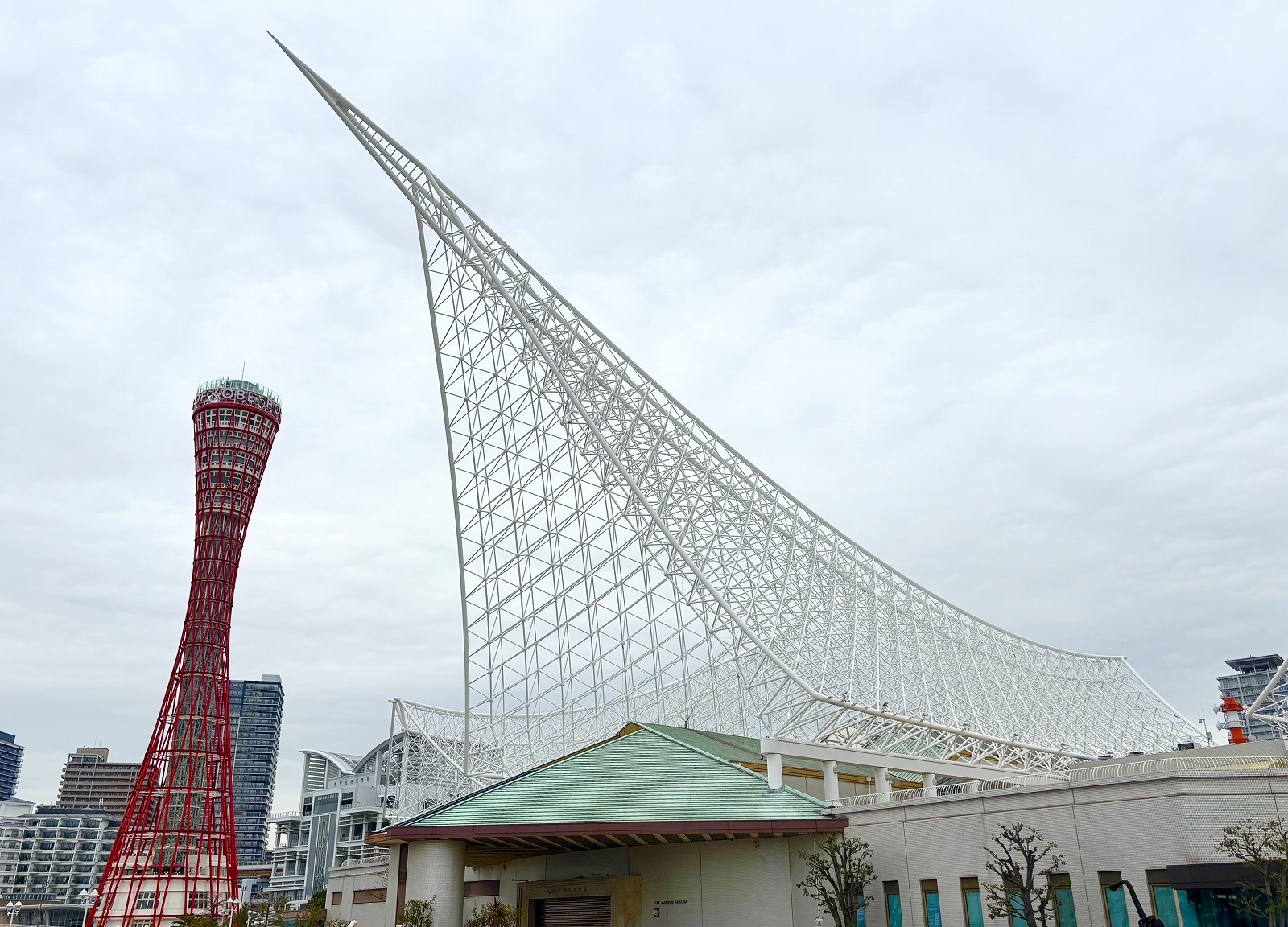 各線元町駅から南へ徒歩約15分、メリケンパークにある「神戸海洋博物館」がこちら。大海原を駈ける帆船の帆と波をイメージした白いスペースフレームの大屋根が特徴的ですね。