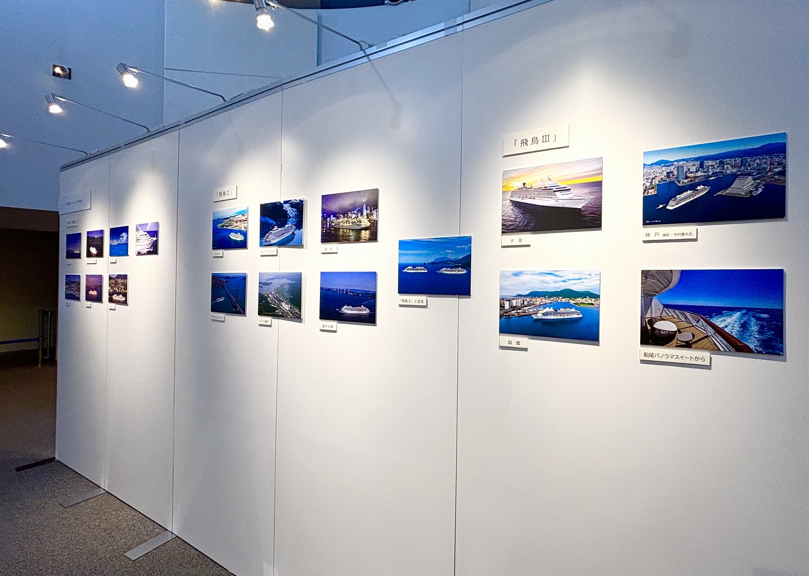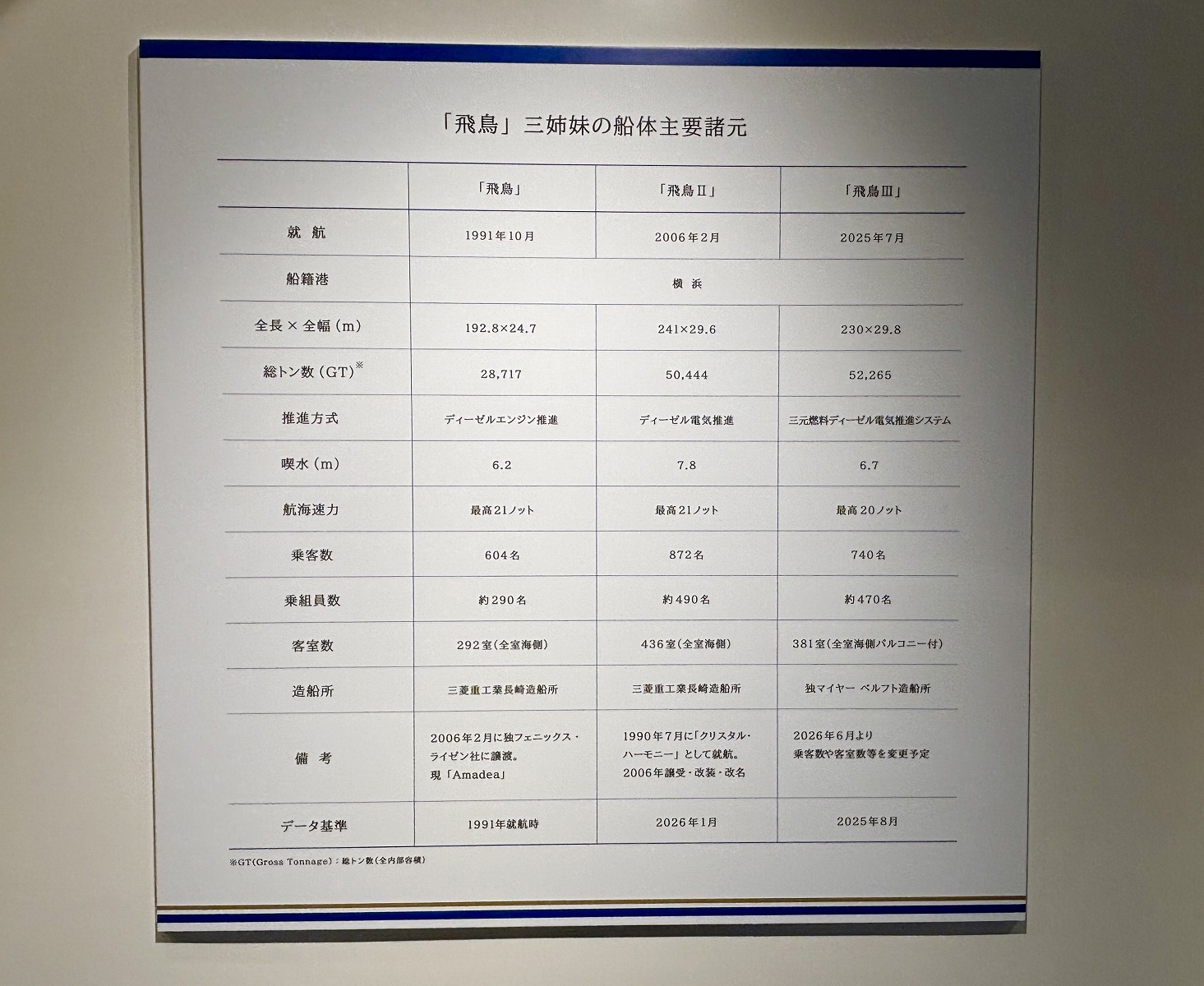 初代の「飛鳥」(現:「Amadea」)、「飛鳥Ⅱ」、そして2025年7月に就航したばかりの「飛鳥Ⅲ」の船体スペックと主な特徴が紹介されており、ファンネル(※エンジンやボイラーの排気ガスを排出するための「煙突」のこと)の特徴や、ファンネルマーク(※船会社のマークやロゴ)の移り変わりなど、船体のパネル写真とともに分かりやすく展示されています。