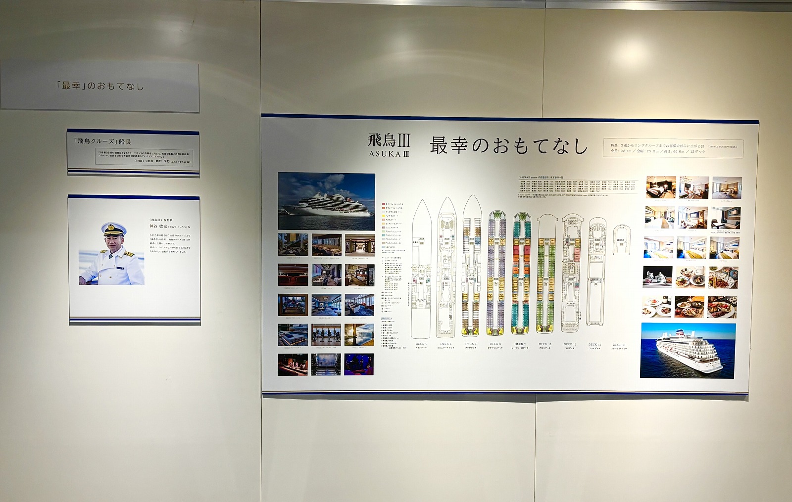 [第2章]飛鳥Ⅲ-新たな物語-船体と設備では、環境に優しい最新鋭のエコシップ ・飛鳥Ⅲ建造ヒストリーや推進方式などが紹介されており、船内で快適に過ごすための食事やサービス、室内の様子などが「最幸のおもてなし」としてパネルで見ることができます。
