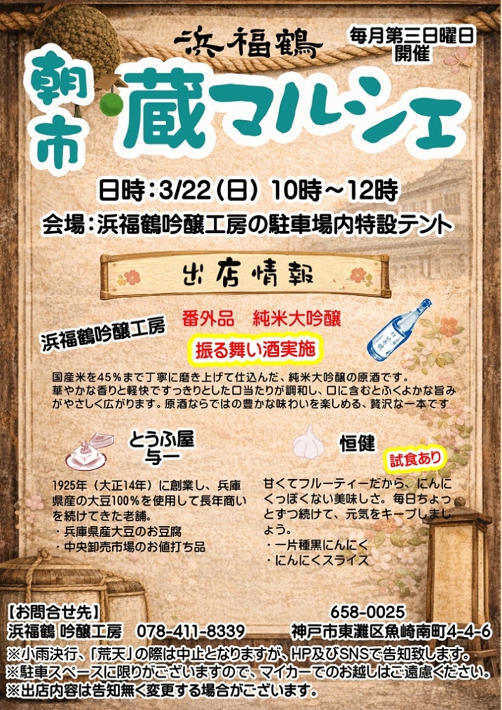 魚崎の浜福鶴さんで「蔵マルシェ(朝市)」が2026年3月22日(日)10:00~12:00に開催予定です。