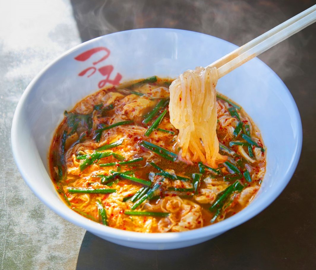 「辛麺」は、唐辛子とにんにくがたっぷり入った牛骨ベースのコクがある赤いスープに、ニラと溶き卵、そして独特な食感のこんにゃく麺が特徴の宮崎のご当地グルメです。