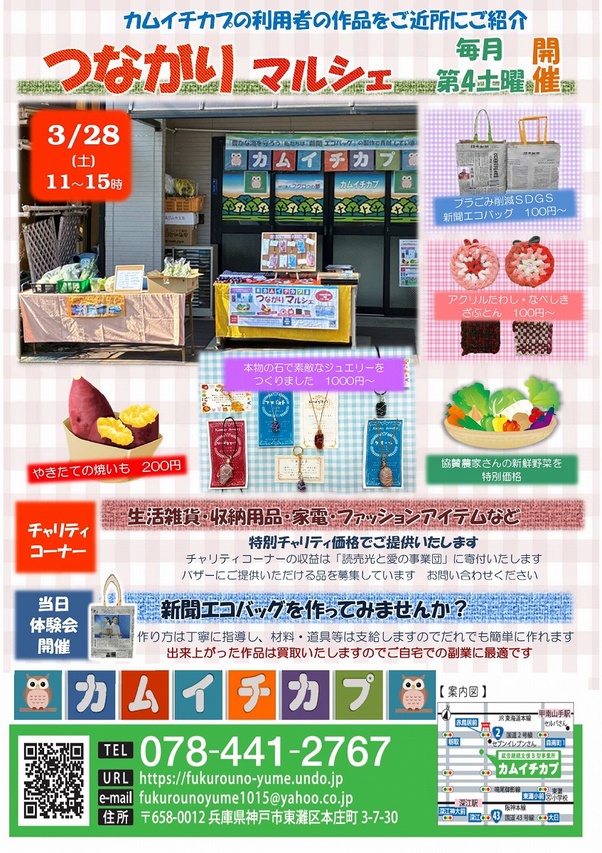 東灘・本庄町にある「カムイチカプ」さんで、「つながりマルシェ」が3月28日(土)11:00~15:00に開催予定ということで、ご案内をお寄せ頂きました。