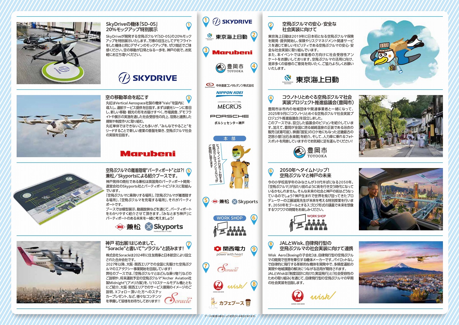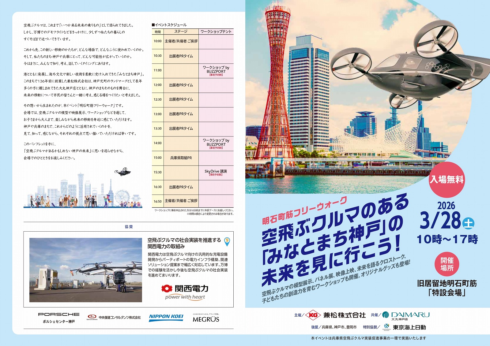 大丸神戸店東側にある明石町筋を歩行者天国とし、空飛ぶクルマの模型展示や映像放映、ワークショップ(子供向け、一般向け)、ステージトークなどが行われます。