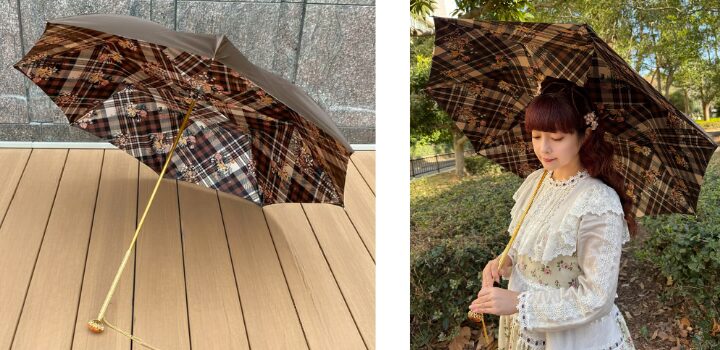 クラシカルなブラウンの色合いで、クラシカルロリータとの相性バッチリです。チェックと花柄の組み合わせが上品です。