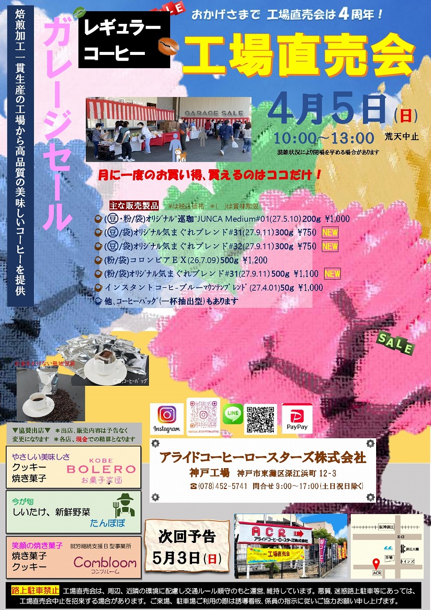 東灘・深江浜町にある「アライドコーヒーロースターズ」さんで、お得な「ガレージセール 工場直売会」が4月5日(日)10時~13時に開催!月に一度のお買い得で、春のコーヒータイムを充実させてね♪ #東灘区 #アライドコーヒーロースターズ #イベント #コーヒー